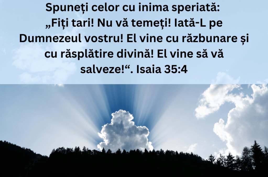 Spuneți celor cu inima speriată: „Fiți tari! Nu vă temeți! Iată-L pe Dumnezeul vostru! El vine cu răzbunare și cu răsplătire divină! El vine să vă salveze!“.