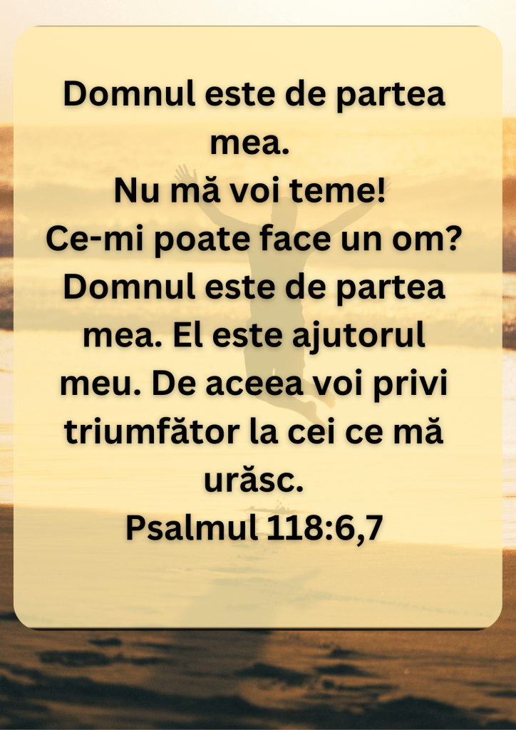 Domnul este de partea mea. Nu mă voi teme! Ce-mi poate face un om? Domnul este de partea mea. El este ajutorul meu. De aceea voi privi triumfător la cei ce mă urăsc.